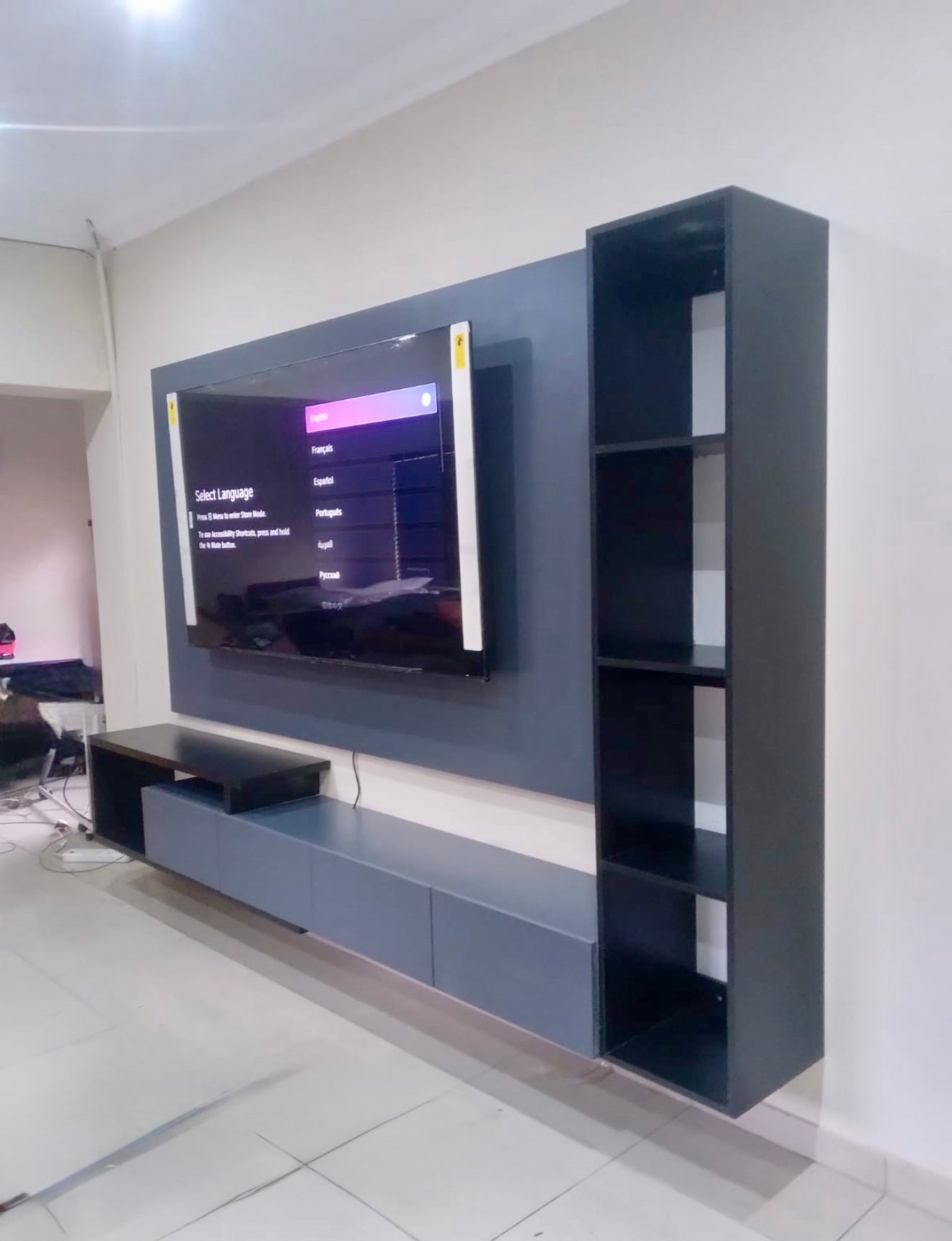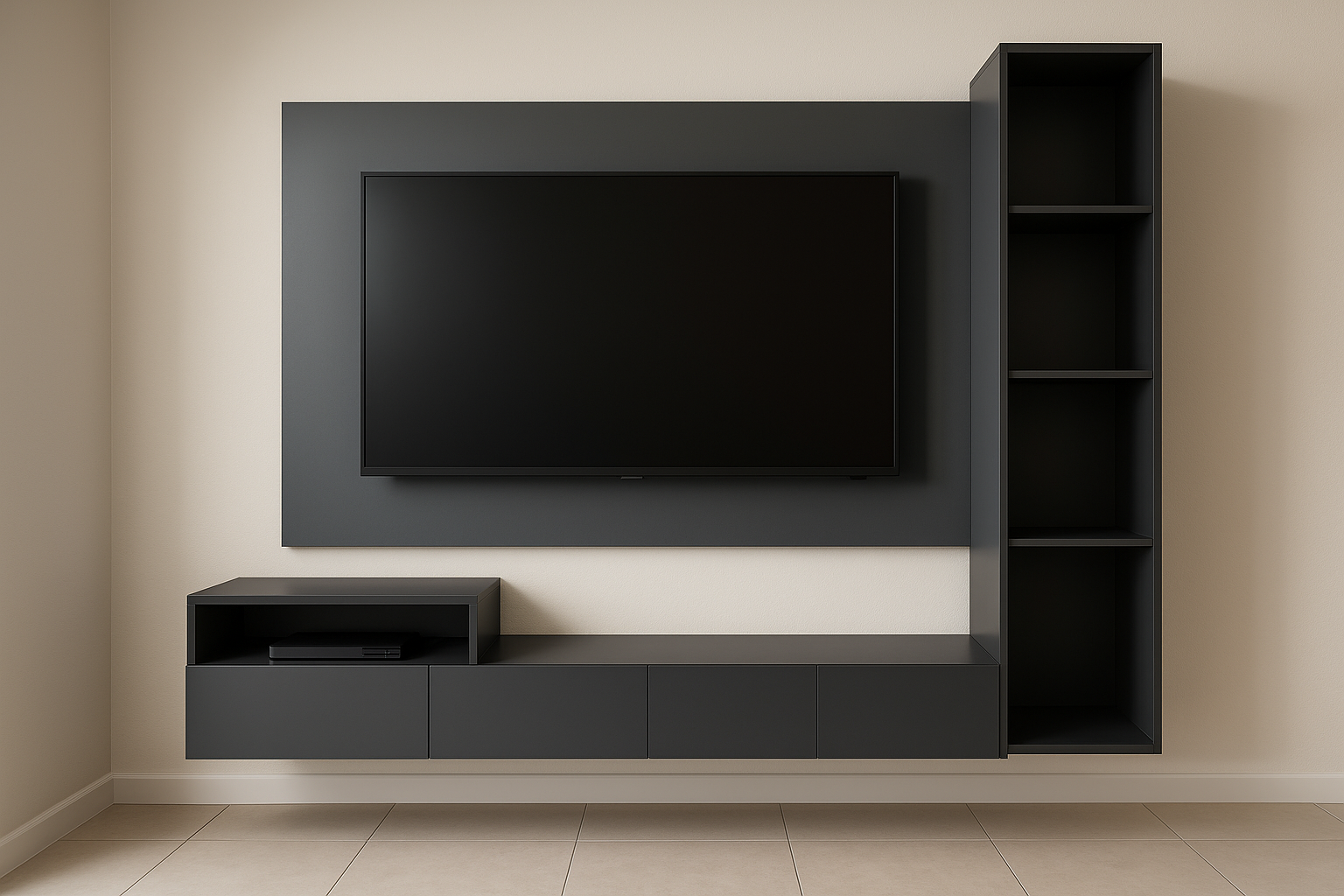Below the TV, a low-profile, floating cabinet provides ample space with four closed storage compartments and an accessible open shelf for media devices or a soundbar. The system is anchored by an adjacent vertical shelving column, offering perfect display space while maintaining the unit's streamlined, floating aesthetic.